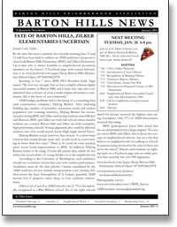 The January 2011 edition of the Barton Hills News is now available online. Features include stories about the proposed closure of Barton Hills and Zilker Elementary schools, Neighborhood Heroes, new BHNA officer profiles, Coyotes in the Hood, Greenbelt Guardians, and much more.