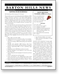 The April edition of the Barton Hills News is now available. Click on the image above to read the latest updates on efforts to keep our exemplary neighborhood elementary school open, find out which longtime Barton Hills resident is heading west after living here since 1957, learn about proposals submitted by members for improvements that could be sponsored by the Association, and much more. The Barton Hills News is published quarterly and is edited by Jennifer Ellen Cook.