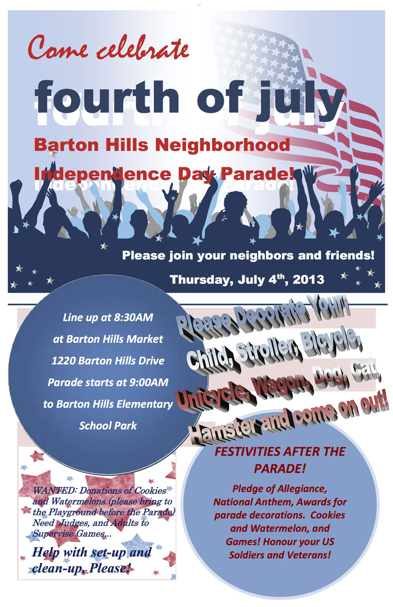 Barton Hills Neighborhood Association Sunny Luther has issued the 2013 July 4 Parade Poster, so you know the event is drawing near! Click the image above to view it online or you can print this full-size PDF version. Sunny is also seeking parade vehicles, so let her know if you can participate!